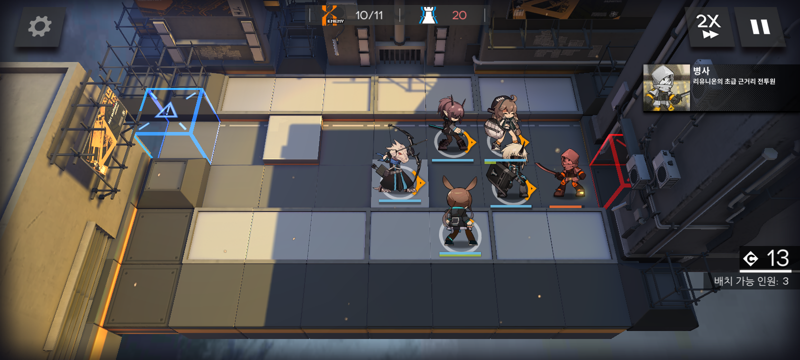 아기자기한 2D 캐릭터가 이 게임의 핵심 오퍼레이터이다. 오퍼레이터를 원하는 곳에 배치하고 공격 방향을 선택하여 생성되는 적을 잡는 디펜스류 게임이다. 요즘 게임에서 없어선 안 될 배속 모드도 있다. 모바일 게임 플레이어들은 빠른 진행을 원하기 때문에 필수 요소라고 생각된다.